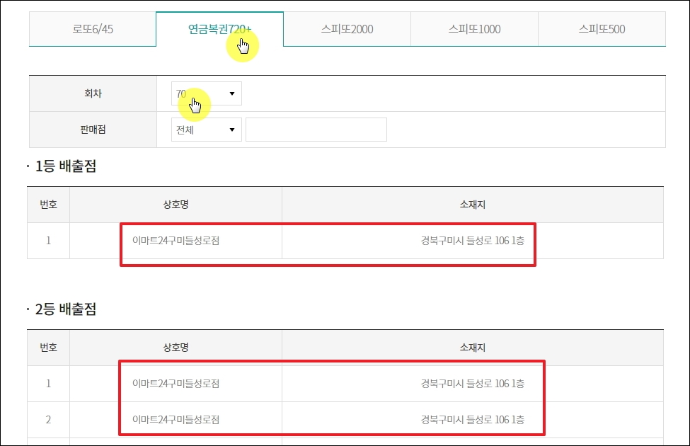 지금까지 연금복권 720+ 당첨자를 배출한 배출점에 대한 주소를 찾을 수 있습니다. 1등과 2등 이렇게 2가지 당첨 순위에 대해 알아볼 수 있어요. 연금복권과 더불어 로또 1등 배출점도 찾을 수 있으니 같이 참고해 보세요.