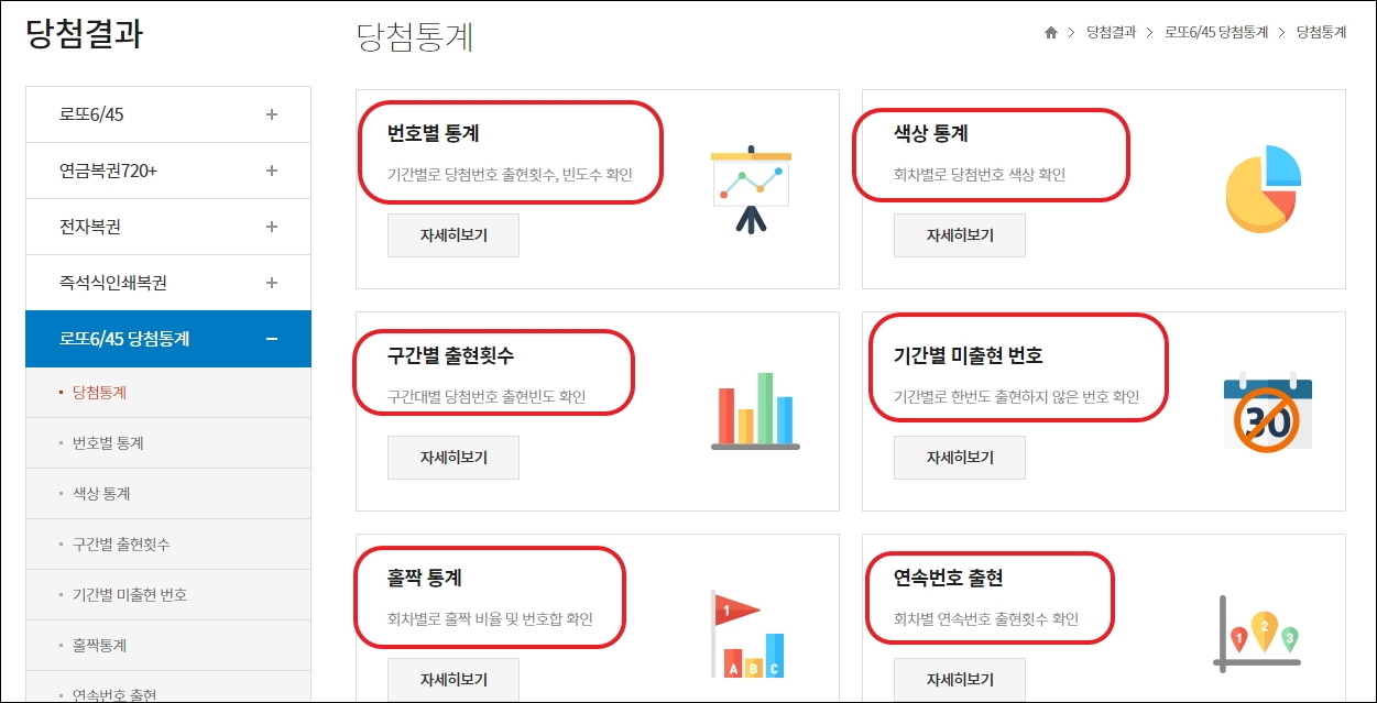 이곳에서 제공하는 통계 자료는 총 6가지 입니다. 번호별 통계, 색상 통계, 구간별 출현횟수, 기간별 미출현 번호, 홀짝 통계, 연속번호 출현 이렇게 6가지 인데요. 활용하고 싶은 자료를 클릭해 보세요.