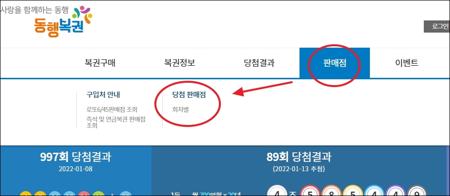 사이트에 접속하면 메뉴에서 "판매점"을 클릭해 보세요. 그럼 세부 카테고리에서 "당첨 판매점"을 찾을 수 있는데요. 클릭해 주세요.