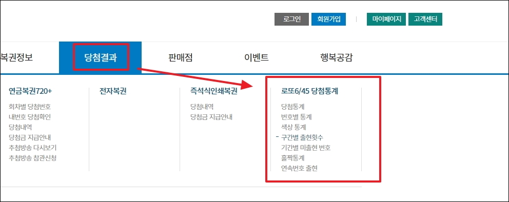 두 번째 연금복권 로또 확률 높이는 방법을 알려드릴게요. 바로 통계 자료를 활용하는 방법입니다. 동행복권 사이트에서 메뉴에 있는 "당첨결과"를 클릭해 보세요. 그럼 여러 가지 통계가 있는데요. 클릭해 보세요.