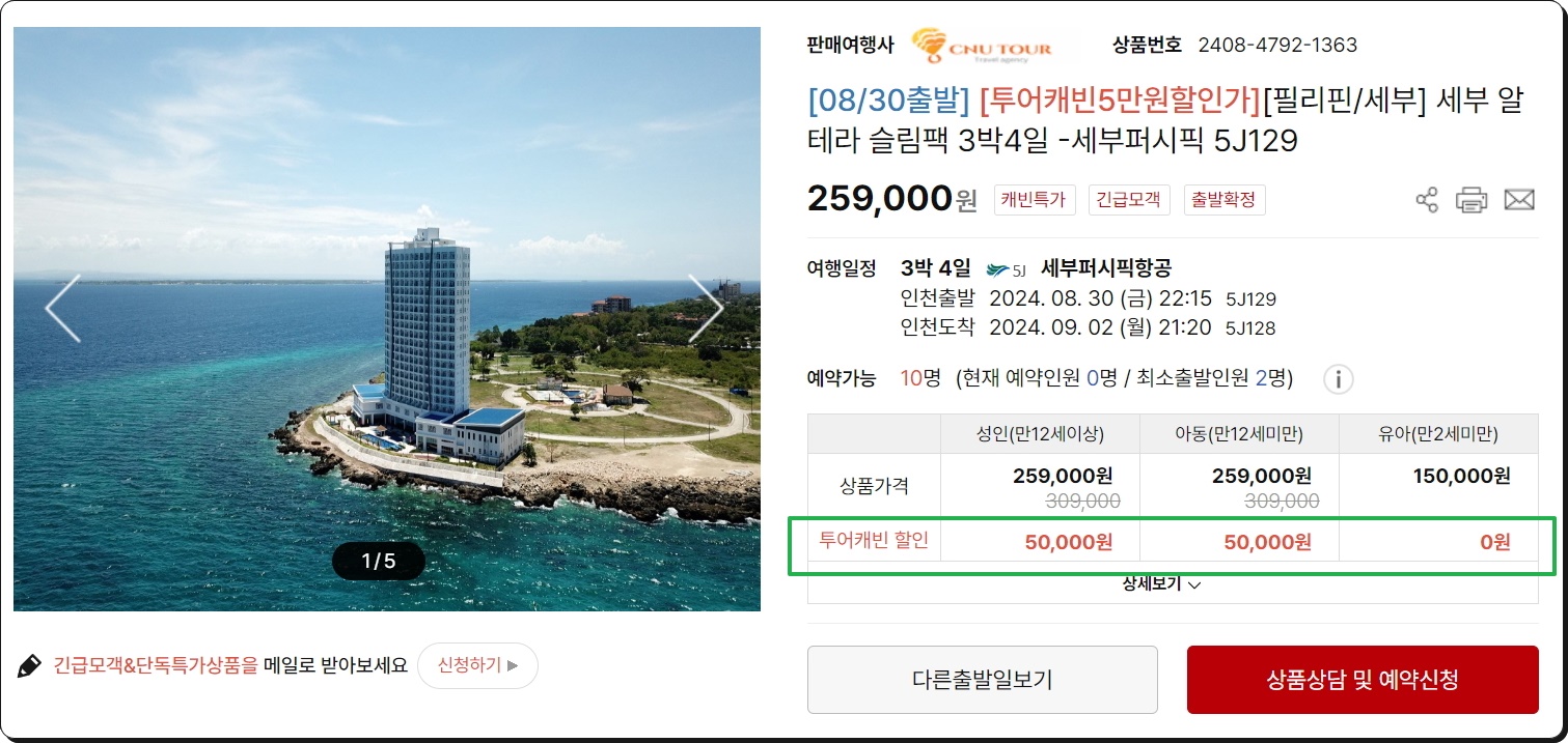 저는 8월 30일에 출발하는 상품을 찾아 보았는데요. 투어캐빈 할인가로 꽤 저렴하게 다녀올 수 있네요. 화면에 표시되어 있는 태그를 보면 긴급모객 땡처리로 판매되는 것임을 알 수 있습니다. 여기서 바로 "예약신청"을 누르면 바로 예약이 가능하죠.