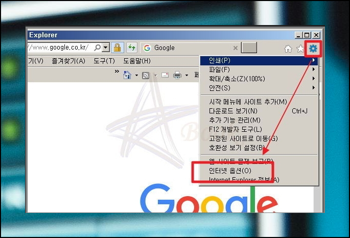첫번째 방법을 진행했음에도 문제가 재발한다면 브라우저의 문제일 수 있습니다. 익스플로러를 연 후에 '인터넷 옵션'을 클릭해주세요. 오른쪽 상단에 설정 버튼이 있습니다.