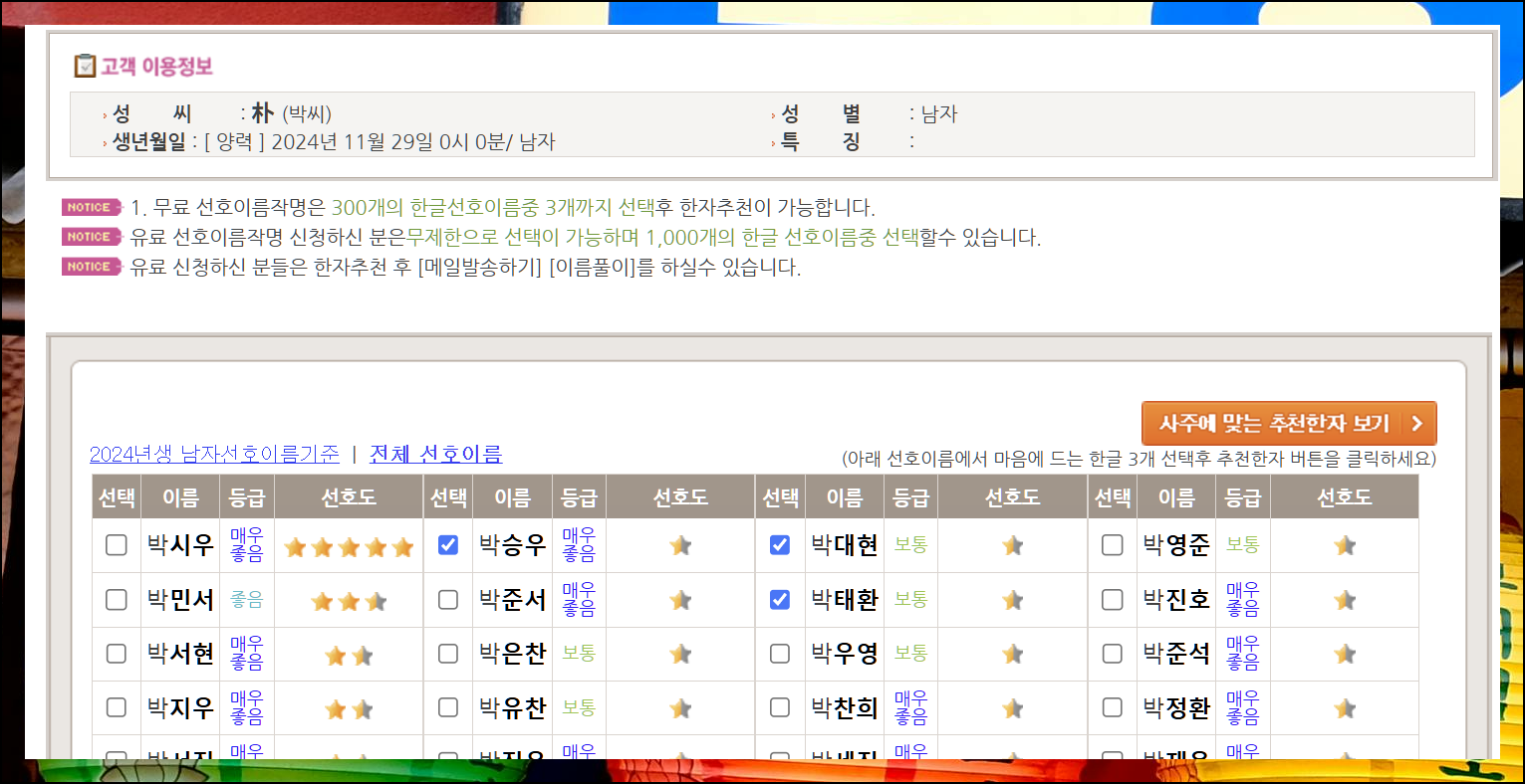 필요한 정보를 모두 입력하고 무료 작명소의 시작 버튼을 누르면 약 300개의 한글 이름을 추천받을 수 있어요. 이 중에서 마음에 드는 3개의 성명을 고른 뒤, 사주에 맞는 추천한자 보기 버튼을 누르면 각자 5개의 한자를 얻을 수 있습니다. 인터넷 작명소 중에서 가장 많은 추천을 받을 수 있죠.