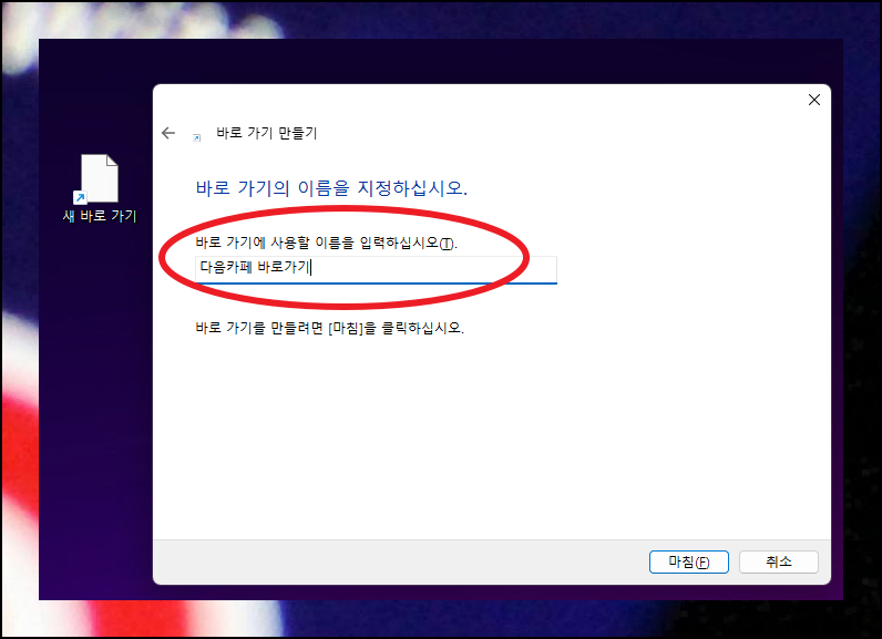 이제 여기에 사용할 명칭을 지정할 차례입니다. "다음카페 바로가기"와 같이 식별하기 쉬운 이름으로 설정하세요.
