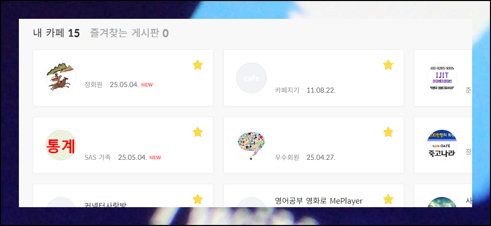 화면에서는 내가 가입한 모임 목록도 확인 가능합니다. 예시로 15개의 다음카페에 가입되어 있고, 준회원이나 정회원으로 활동 중인 상태를 볼 수 있어요.