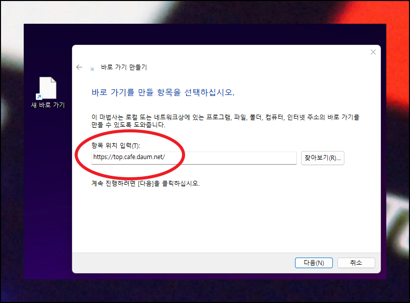 바로가기 생성 창이 열리면 항목 위치 입력란에 "top.cafe.daum.net"이라는 웹주소를 정확히 입력합니다. 이것은 다음카페의 공식 접속 경로입니다.