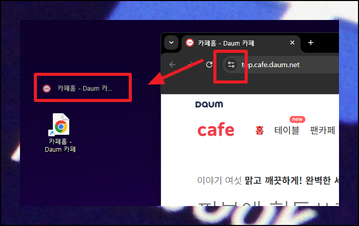이제 다음카페로 빠르게 접속하는 단축 버튼을 만들어볼까요? 현재 보고 있는 웹페이지에서 마우스 포인터가 가리키는 부분을 클릭한 후, 데스크톱으로 끌어다 놓으세요.