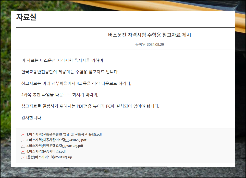 사이트 내 자료실에는 운전 관련 다양한 카테고리가 준비되어 있어요. 버스운전 관련 섹션을 클릭하면 "자격시험 수험용 참고자료"를 손쉽게 다운로드할 수 있습니다.