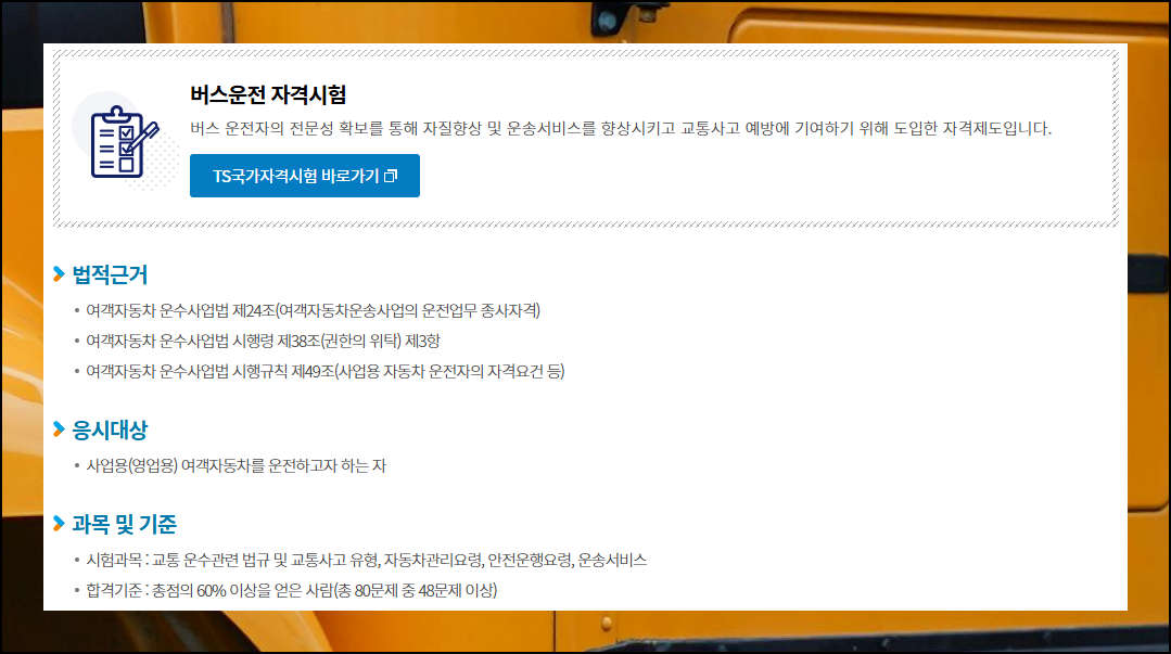 웹사이트에 접속하면 버스운전 자격시험에 대한 상세한 가이드를 볼 수 있어요. 접수부터 합격 조건까지 모든 내용이 정리되어 있습니다. 상단의 '바로가기' 메뉴를 클릭하면 수험자료를 비롯한 추가 정보들을 확인할 수 있어요.