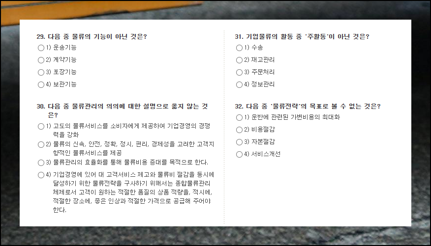 화물운송 관련 기출문제집 영역으로 이동하면 실전 연습을 시작할 수 있어요. 실제 출제되는 문제와 동일한 유형과 난이도를 경험할 수 있습니다. 다운로드 없이 바로 풀어볼 수 있어서 편리해요.